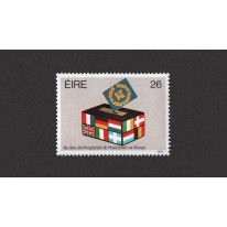 Na znaczku widnieje urna wyborcza w kolorach flag państw członkowskich Unii Europejskiej.