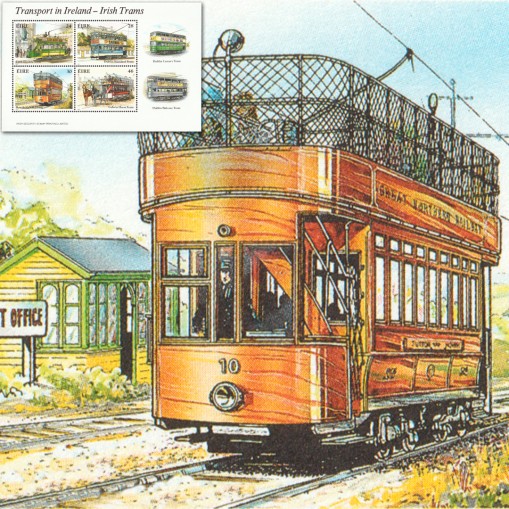 Na znaczkach przedstawiono różne elektryczne i konne tramwaje, których używano w Irlandii w miastach Cork, Dublin, Howth i Galway.