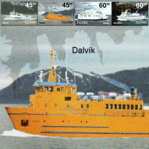 Na znaczkach widnieją islandzkie promy pasażerskie, kolejno: „Sæfari”, „Sævar”, „Herjólfur” i „Baldur”.