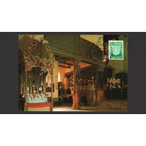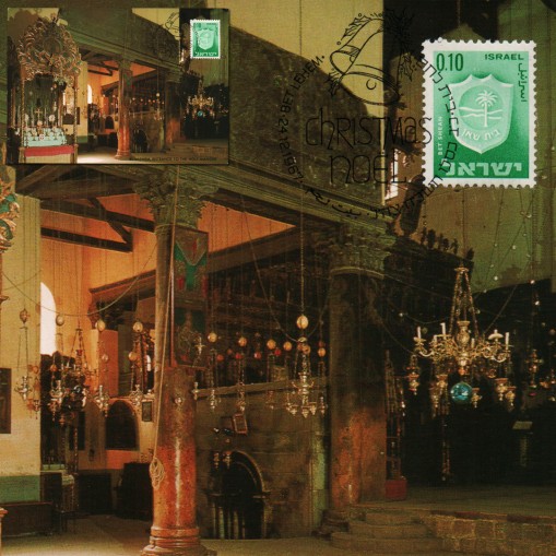 Znaczek obiegowy na karcie pocztowej przedstawiającej wejście do Kaplicy Żłóbka w betlejemskiej Bazylice Narodzenia Pańskiego.
