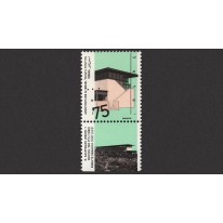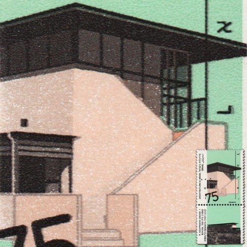 Znaczek z przywieszką, na którym widnieje jeden ze słynnych projektów architektonicznych w Izraelu - szkoła w kibucu Degania zaprojektowana przez Richarda Kauffmanna.