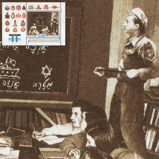 Na znaczku w bloku widnieje żołnierz uczący dzieci języka hebrajskiego, przygotowując je do imigracji do Izraela.