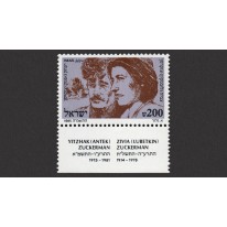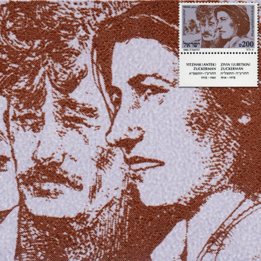 Znaczek z przywieszką upamiętniający Cywię i Icchaka Cukiermanów, polskich Żydów, działaczy syjonistycznych, w czasie II wojny światowej mieszkańców getta warszawskiego, członków żydowskiego ruchu oporu, po wojnie założycieli kibucu Lochame ha-Geta’ot i Muzeum Bojowników Getta. Ichhak Cukierman był ostatnim komendantem Żydowskiej Organizacji Bojowej.