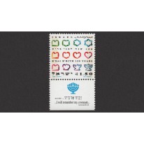 Na znaczku widnieją symbole gwiazdy Dawida, serca i świecznika siedmioramiennego wyodrębnione z rysunku tablicy dziecięciu przykazań.