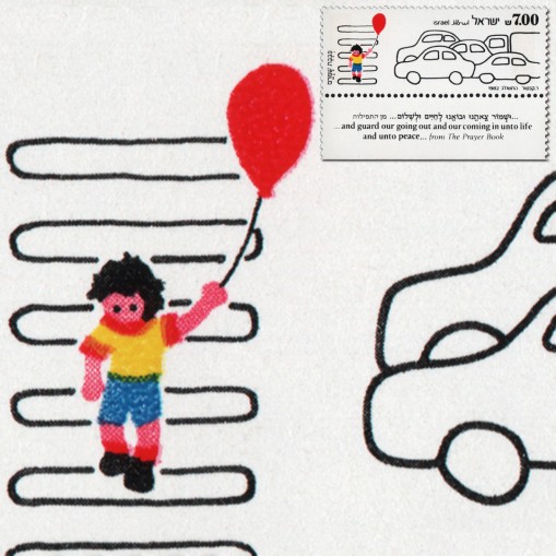 Na znaczku widnieje dziecko na przejściu dla pieszych i samochody.