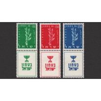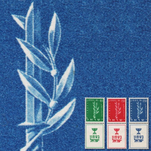 Na znaczkach widnieje symbol Hagany, żydowskiej organizacji paramilitarnej działającej w latach 1920-1948 w ówczesnym Mandacie Palestyny.