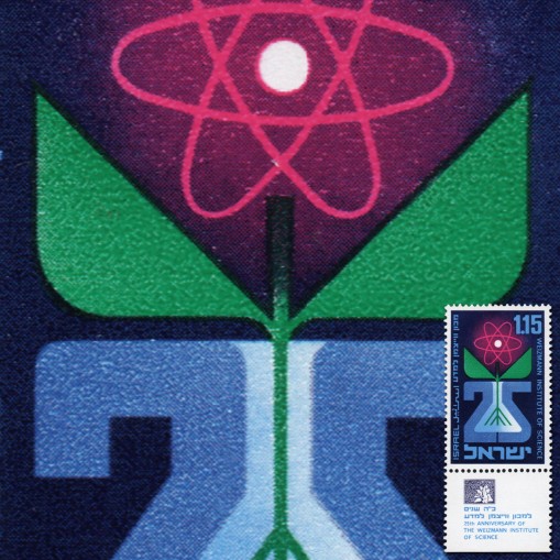 Znaczek z przywieszką upamiętniający 25. rocznicę założenia Instytutu Naukowego Weizmana.