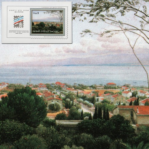 Na znaczku w bloku przedstawiono widok kolonii niemieckiej w Hajfie na obrazie Gustawa Bauernfeinda.