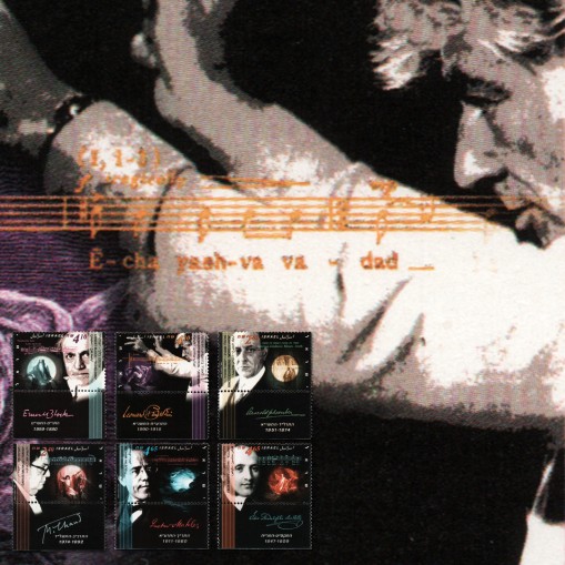 Kompletny zestaw czterech serii z przywieszkami, na znaczkach których widnieją następujący kompozytorzy pochodzenia żydowskiego: