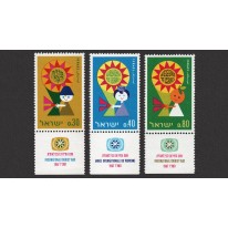 Na znaczkach widnieją postaci z kwiatami i napisem „Witamy w Izraelu”.