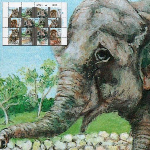 Seria w arkuszu, na znaczkach której widnieją gatunki zwierząt w ogrodzie zoologicznym: lampart perski, słoń indyjski, szympans i lew azjatycki.