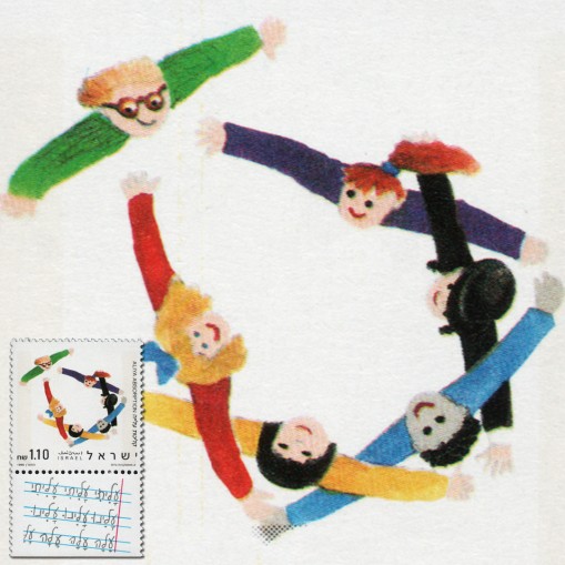Na znaczku widnieją sylwetki ludzkie układające się w gwiazdę Dawida.