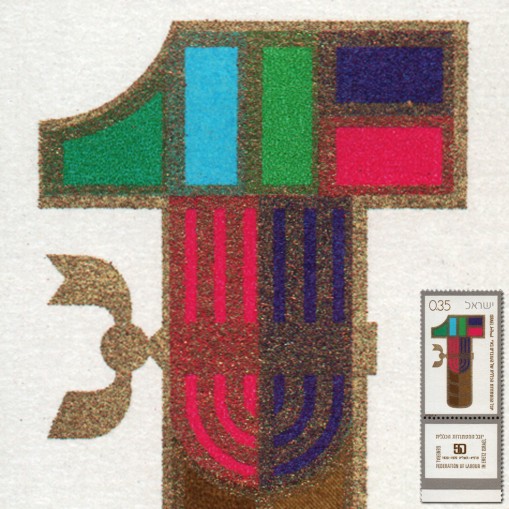 Znaczek z przywieszką upamiętniający 50-lecie Histadrut, ogólnoizraelskiego związku zawodowego.