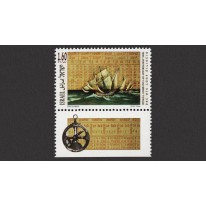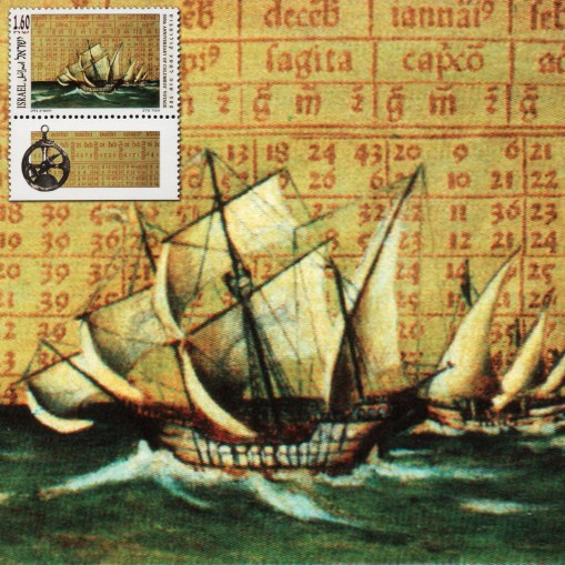 Na znaczku widnieje flota Kolumba oraz fragment „Almanach Perpetuum”, czyli tabeli dokładnych pozycji Słońca, Księżyca i pięciu planet służącą do nawigacji i opracowaną przez Abrahama Zacuto, kastylijskiego astronoma pochodzenia żydowskiego, astrologa, matematyka, rabina i historyka, który służył jako nadworny astronom króla Portugalii Jana II.