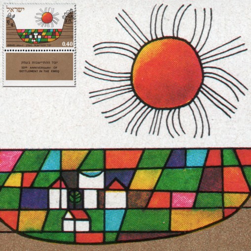 Znaczek z przywieszką upamiętniający 50-lecie żydowskiego osadnictwa w Dolinie Jezreel.