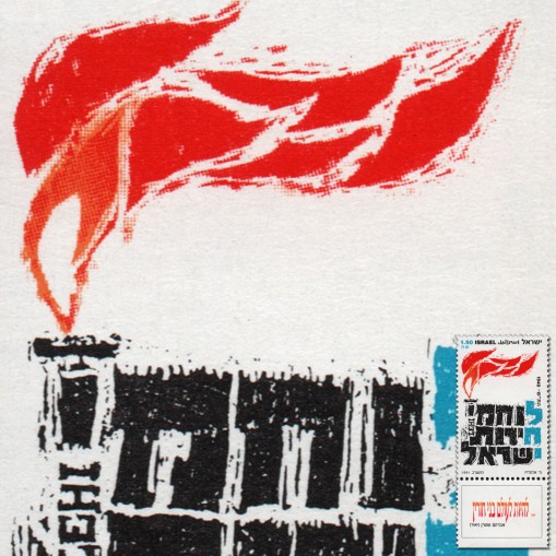 Na znaczku widnieje płomień i napis po hebrajsku.