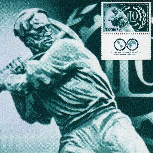 Na znaczku widnieje pomnik robotnika znajdujący się w ogrodzie kwatery głównej tej organizacji w Genewie.
