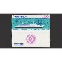 Znaczek z przywieszką upamiętniający dziewiczy rejs promu pasażerskiego „Shalom”, który widnieje na znaczku.
