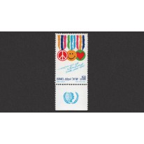 Na znaczku widnieją medale z symbolami pokoju, uśmiechniętej twarzy i serca.