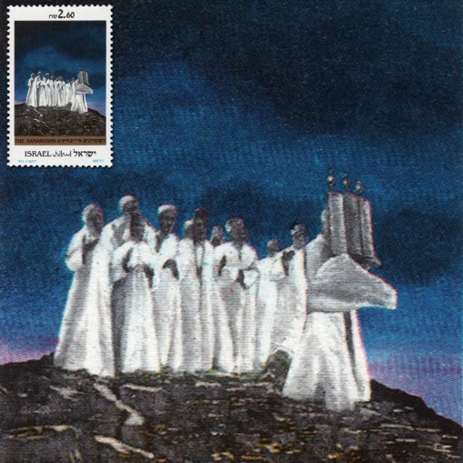 Na znaczku widnieją Samarytanie modlący się na górze Garizim, jedynym świętym miejscu Samarytan.