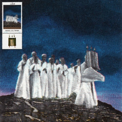 Na znaczku widnieją Samarytanie modlący się na górze Garizim, jedynym świętym miejscu Samarytan.