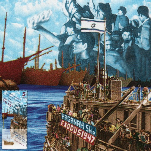 Na znaczku widnieje statek „Exodus” w porcie w Hajfie.