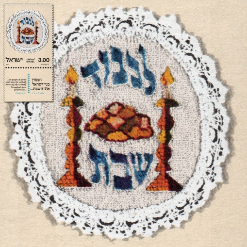 Na znaczku widnieje haft przedstawiający szabatowe świece i bochenki chleba.