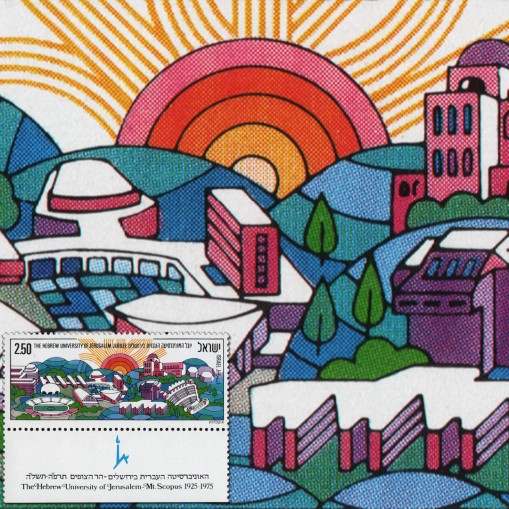 Na znaczku widnieją pierwsze budynki uczelni na wzgórzu Skopus oraz nowsze budynki położone niżej.