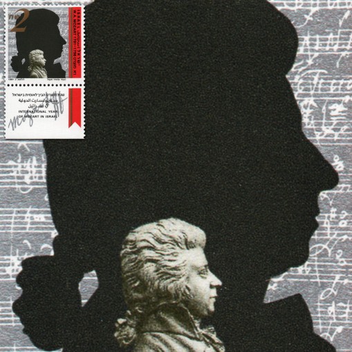 Znaczek z przywieszką upamiętniający dwusetną rocznicę śmierci kompozytora Wolfganga Amadeusza Mozarta.