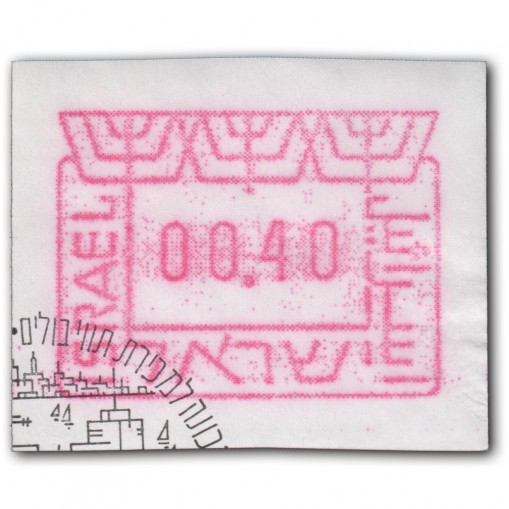 Kasowany znaczek sprzedawany w automatach w dowolnych wybranych przez kupującego nominałach, drukowany na białym papierze. Oferowany walor ma nominał 0,40 NIS.