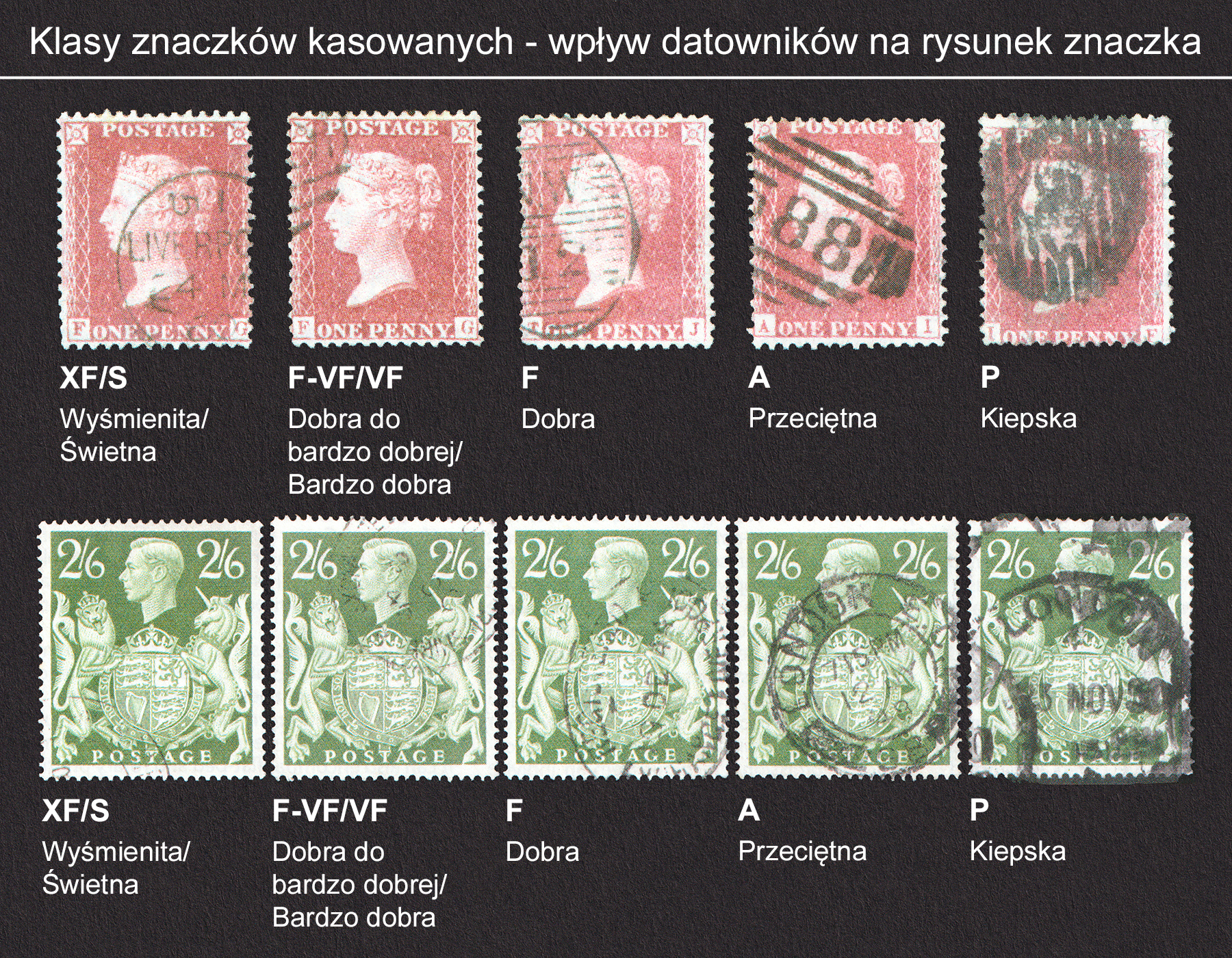 - P (poor = kiepska). Ząbkowanie wcina się głęboko w rysunek znaczka, zaś datowniki na walorach kasowanych są grube, rozmazane i generalnie zakrywają rysunek znaczka. Do tej klasy zalicza się walory z naddarciami, liniami po zgięciach czy prześwieceniami (obszarami cieńszego papieru).