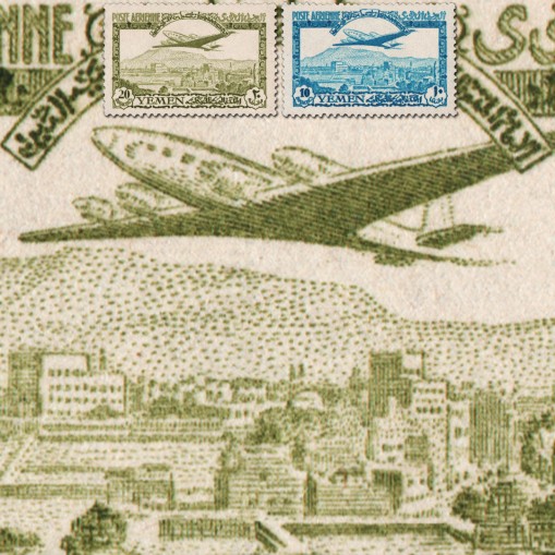 Na znaczkach widnieje samolot Douglas DC-4 ponad miastem Sana, stolicą Jemenu.