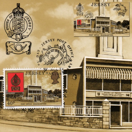 Na karcie widnieje obiegowy znaczek wydany w 1976 roku, na którym widnieje główny urząd pocztowy na Jersey i herb administracji pocztowej Jersey.