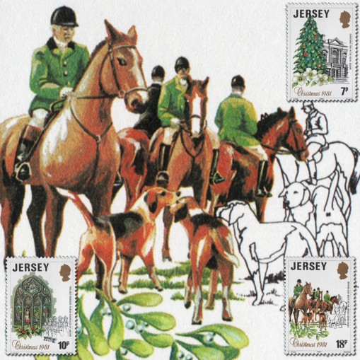 Na znaczkach widnieją kolejno: choinka na Royal Square, witraż w kościele w St. Helier oraz polowanie na lisy w drugi dzień świąt.