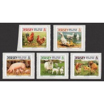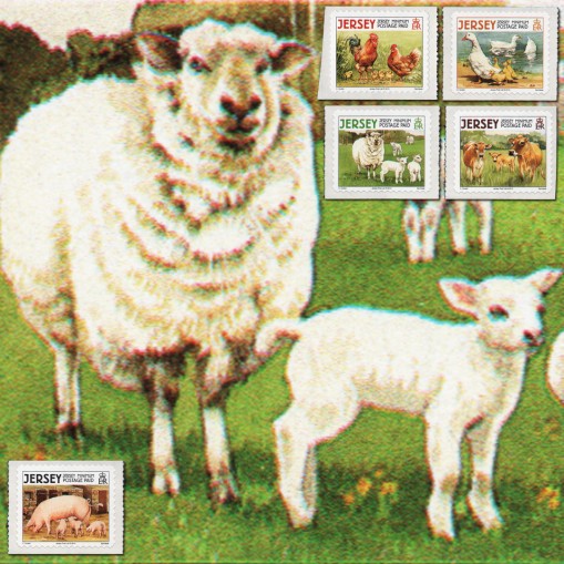 Samoprzylepne znaczki, na których widnieją następujące gatunki zwierząt gospodarskich: kury, owce, świnie, kaczki i krowy.
