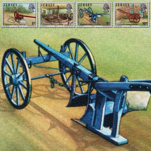Seria ukazująca narzędzia rolnicze z XIX. wieku, kolejno: kopaczkę do ziemniaków, prasa do jabłek używana przy produkcji cydru, pług konny i wóz na siano.