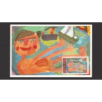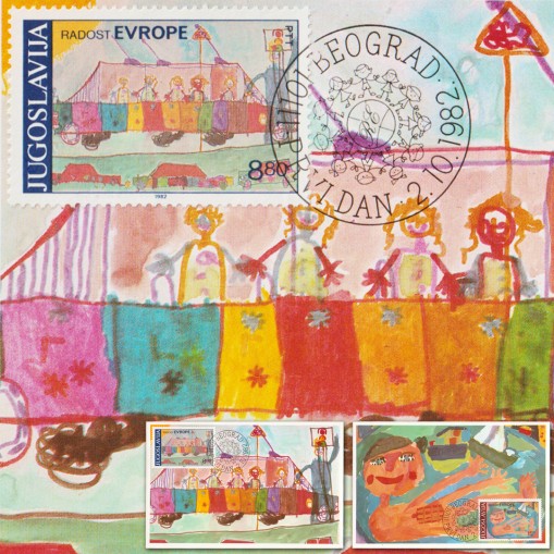 Znaczki na kartach maksimum promujące europejskie spotkania dzieci pod hasłem "Radość Europy".