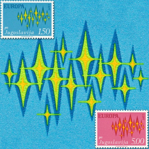 Projektantem emisji EUROPA z 1972 roku był artysta fiński Paavo Huovinen, zaś dizajn to znana filatelistom zorza polarna (Aurora borealis) - każdy przebłysk reprezentuje kraj członkowski wspólnej Europy. Dla ciekawości, Aurora (pol. jutrzenka, zorza) była w mitologii rzymskiej boginią zorzy porannej, brzasku i świtu (poranku). Była utożsamiana z grecką Eos.