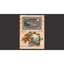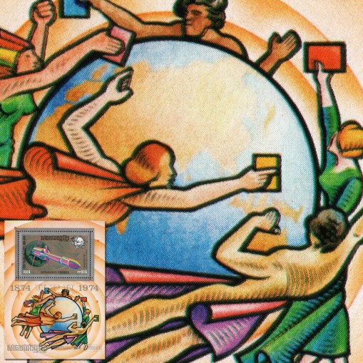 Znaczek w bloku upamiętniający stulecie Światowego Związku Pocztowego.