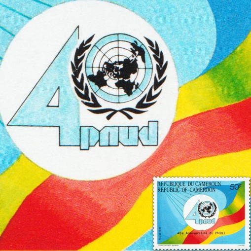 Znaczek upamiętniający 40-lecie istnienia Programu Narodów Zjednoczonych ds. Rozwoju. Działania UNDP wspierają pozytywne zmiany w krajach poprzez udostępnianie społeczeństwom wiedzy, doświadczenia oraz środków pieniężnych i intelektualnych.