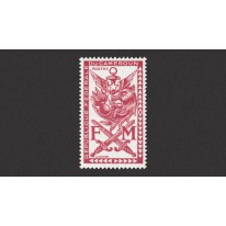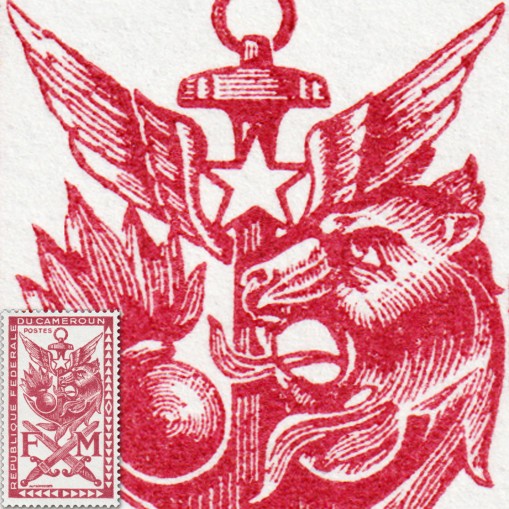 Znaczek emisji wojskowej, na którym widnieją symbole sił zbrojnych Kamerunu, m.in. skrzyżowane miecze, kotwica i skrzydła.