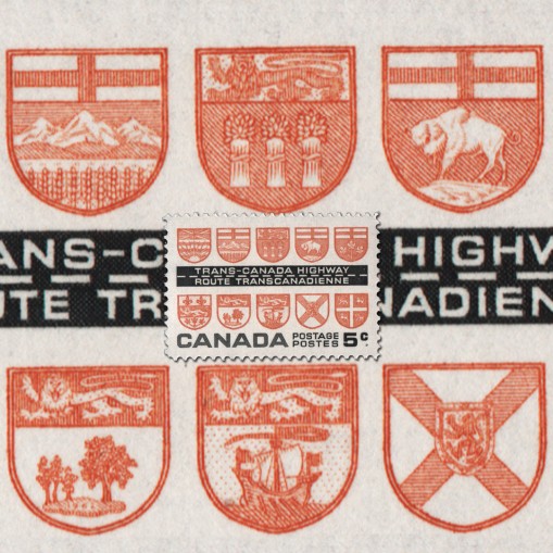 Znaczek upamiętniający otwarcie systemu autostrad biegnących przez wszystkich dziesięć kanadyjskich prowincji (ang. Trans-Canada Highway).