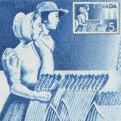 Znaczek upamiętniający 50. rocznicę założenia kanadyjskich prowincji Saskatchewan i Alberta.