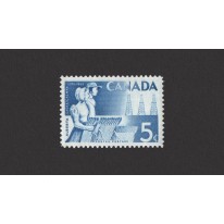 Na znaczku widnieje para osadników oraz symbole rolnictwa i przemysłu wydobywczego.