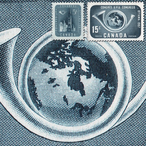 Na znaczkach widnieją budynki parlamentu w Ottawie i trąbka pocztowa z kulą ziemską.