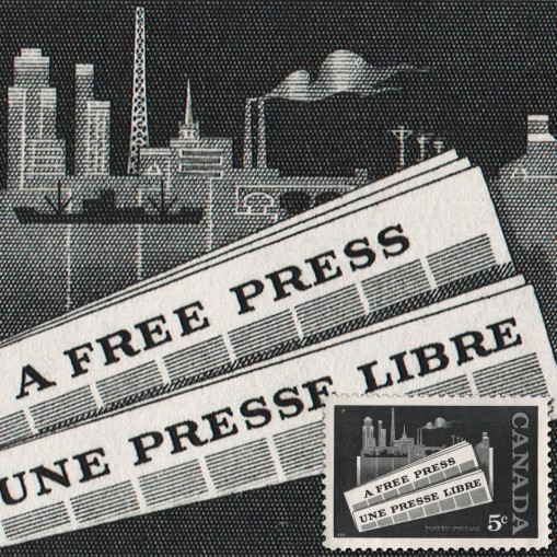 Na znaczku widnieje gazeta oraz sylwetki wieży radiowej, drapaczy chmur, fabryki i statku transportowego.