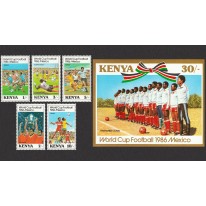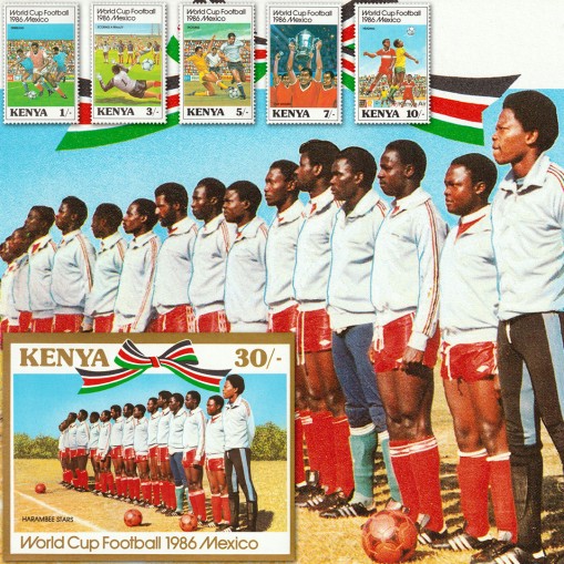 Kenia nie brała udziału w tym Mundialu, ale wydała te oto znaczki oraz blok, na których przedstawiono różne akcje piłkarskie oraz drużynę narodową Kenii („Harambee Stars”).