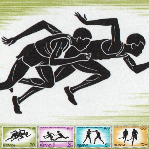 Na znaczkach widnieją kolejno: bieg, bieg przez płotki, boks i hokej.