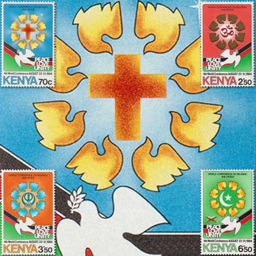 Te ładne znaczki promują pokój pomiędzy różnymi religiami, a przedstawiają gołąbka pokoju oraz symbole chrześcijaństwa, hinduizmu, sikhizmu oraz islamu.