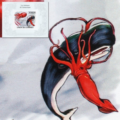 Znaczek w bloku, na którym widnieją gatunki morskiej fauny Antarktyki: kałamarnica kolosalna i kaszalot spermacetowy.
